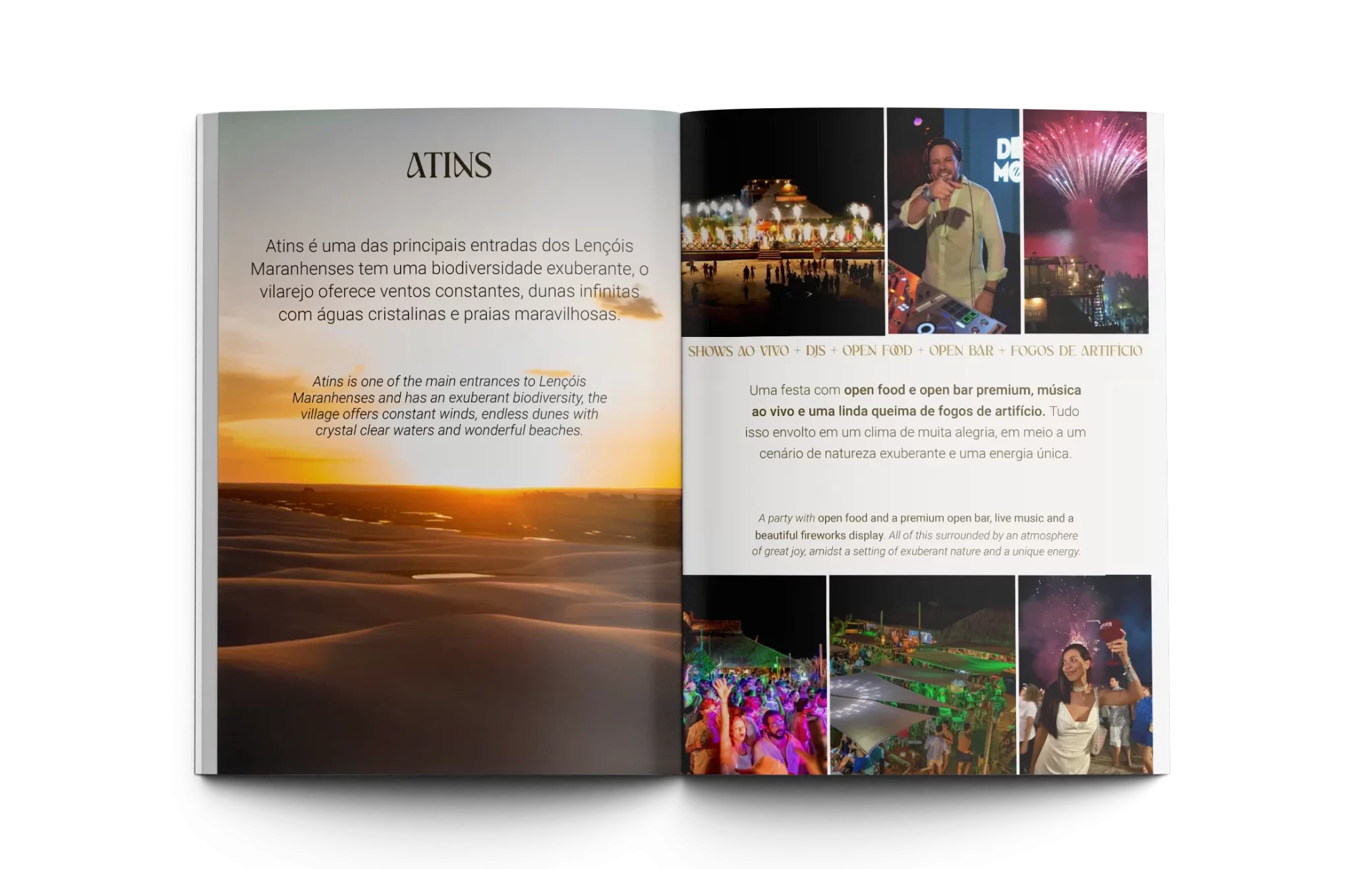Open food e open bar premium garantem que você aproveite a noite sem preocupações. Música ao vivo e DJs criam a trilha sonora perfeita para dançar descalço na areia. E quando a meia-noite chega, uma queima de fogos ilumina o céu e reflete nas águas, criando um espetáculo visual que marca o início de um novo ciclo.