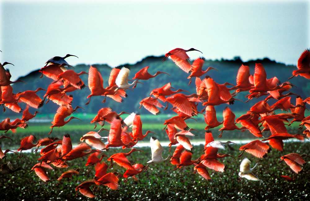 Revoada dos guarás ao entardecer, quando milhares de aves tingem o céu de vermelho em um espetáculo da natureza que emociona até os viajantes mais experientes.